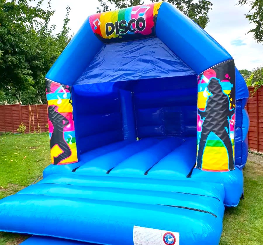 Disco theme glossy bouncy castle comes with bluetooth speakers and disco lights included suitable for children for all indoor and outdoor events in Worcestershire!